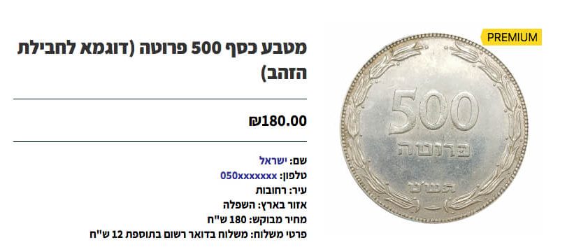 - מודעה תופיע באזור מודעות פרמיום במשך 30 יום - חשיפה לגולשים במיקום עליון