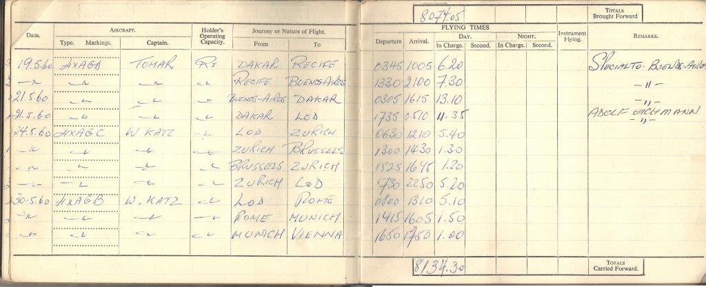 ברור שהאירוע המשמעותי הבא הוא הבאת אייכמן לארץ על ידי מטוס "אל על" לאחר חטיפת. הבאת אייכמן לארץ היתה משמעותית לעם ישראל והחדרת הפחד לנאצים אשר הסתובבו בחופשיות בערים רבות בעולם. ברשותי ספר הטיסה של אחד מאנשי הצוות אשר היה בטיסה זו. על טיסה זו נכתב רבות רק אציין כי אייכמן הולבש בבגדי טייס של אל על ובזריקת טישטוש הורדם/טושטש שפכו עליו אלכוהול ועלו למטוס שהוא נתמך עם שני "אנשי צוות אוויר" כשיכור שחזר מערב בילוי מענג.
