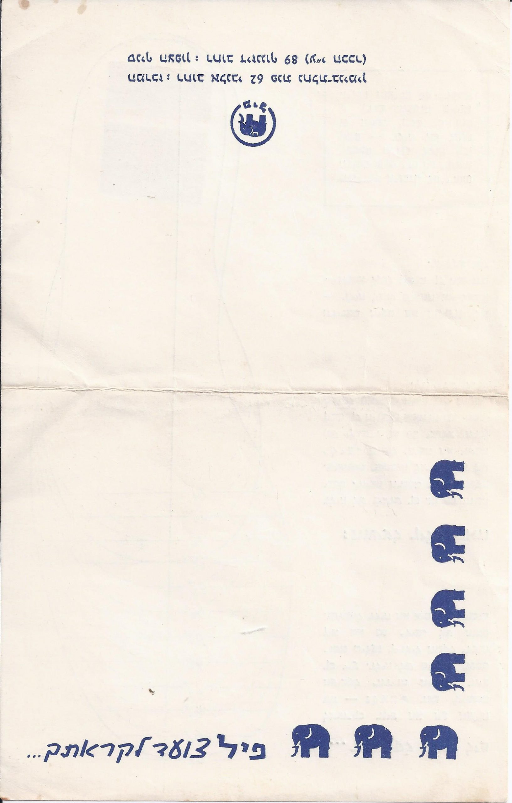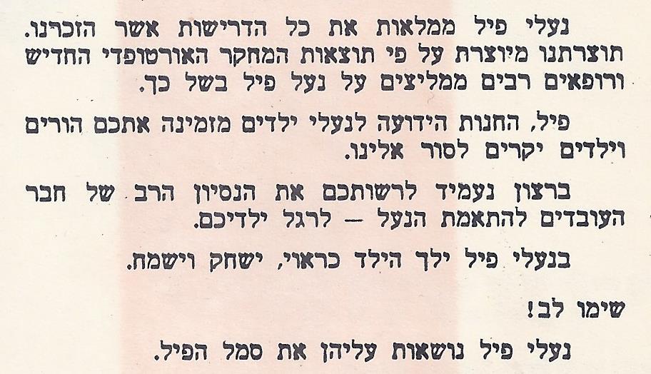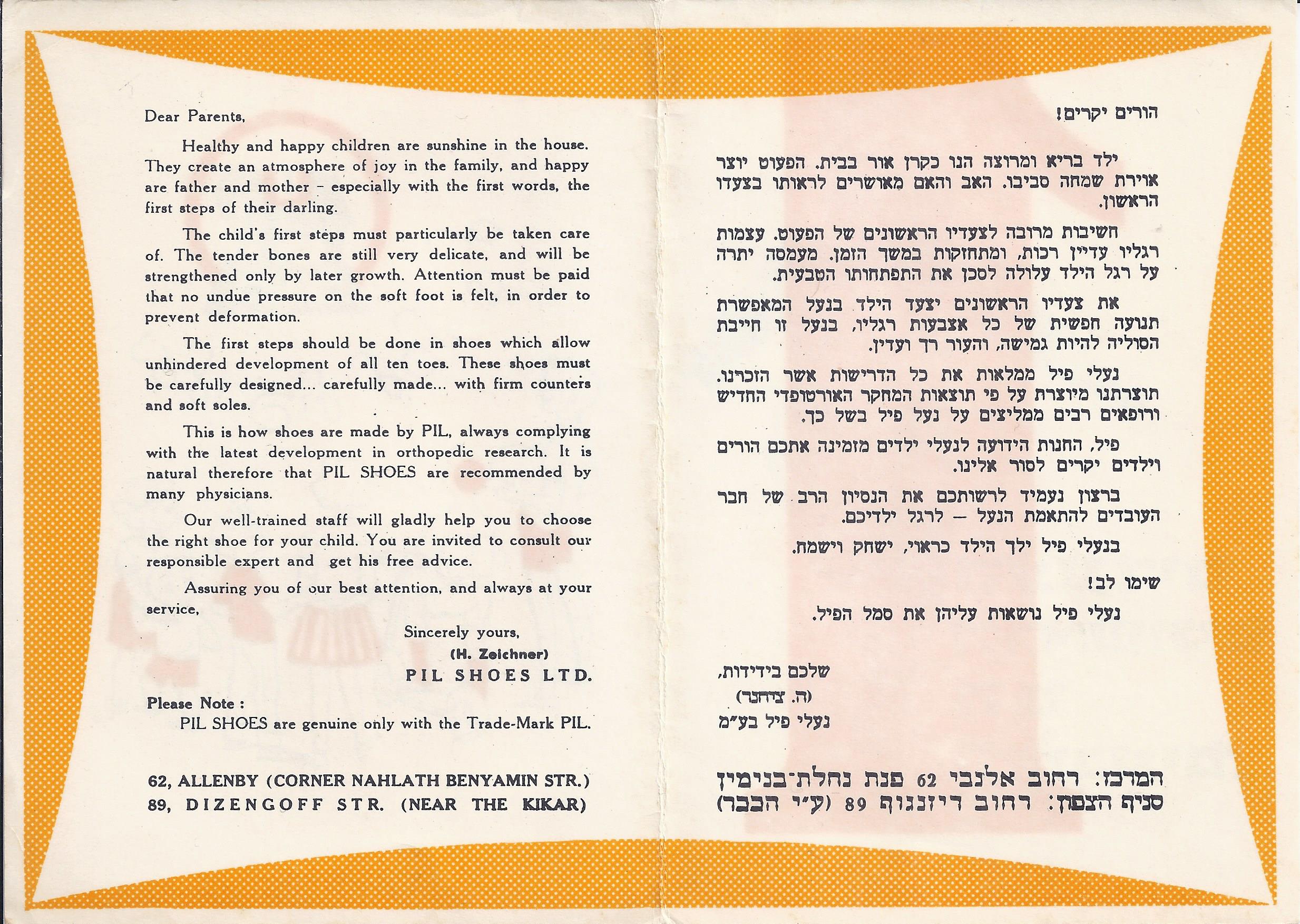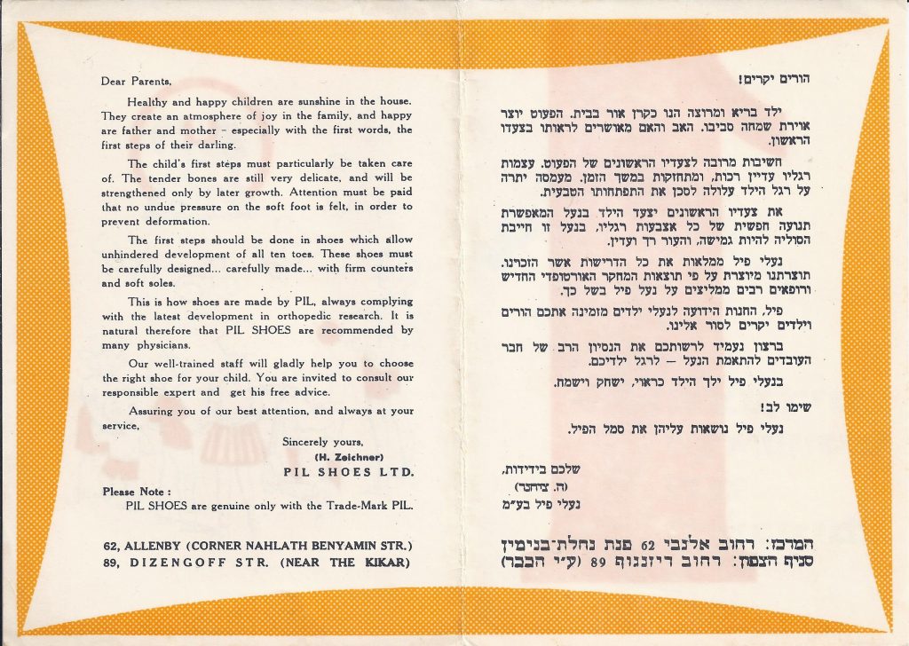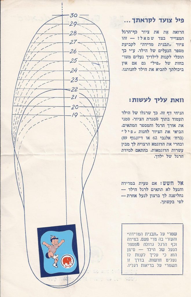 כידוע אני אספן "ישראליינה". אני לא אוסף נעלים אבל אני כן אוסף גרפיקה ארץ ישראלית וישראלית. והפעם בקצרה ובלי הרבה תמונות לפניכם מאמר קצר על נעלי פיל. אומנם יש לי מודעות ועוד אבל הפעם ברצוני להראות את הפרוספקט משנות השישים של נעלי פיל, וכן את דף הפירסום שלהם שמצד אחד הלוגו והכתובת ומצידו השני ציור של תבנית מדידה לקביעת מספר הנעלים של הילד.