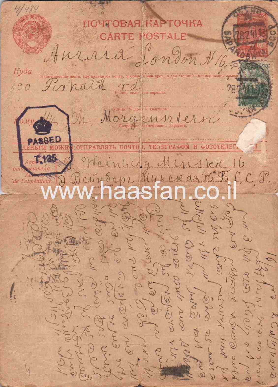 פירוט: יודאיקה – גלוית וינטג' מקורית ביידיש שנשלחה מברית המועצות ללונדון ב-1941 במהלך מלחמת העולם השנייה
