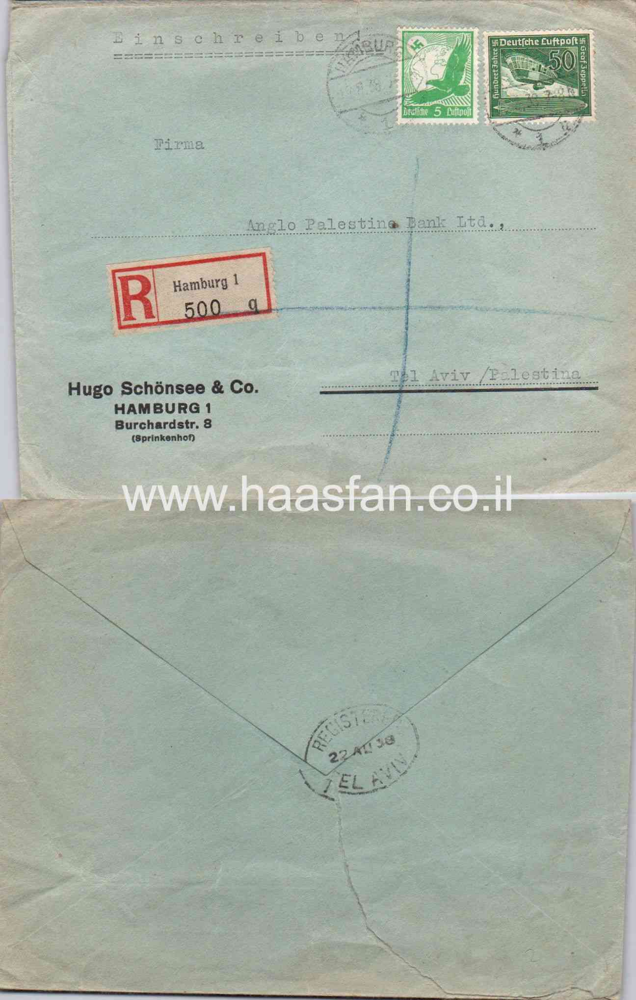Product: Registered letter sent in 1938 from Hamburg (Nazi Germany) to Anglo-Palestine Bank in Tel Aviv (Palestine)