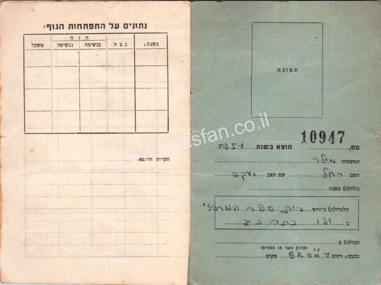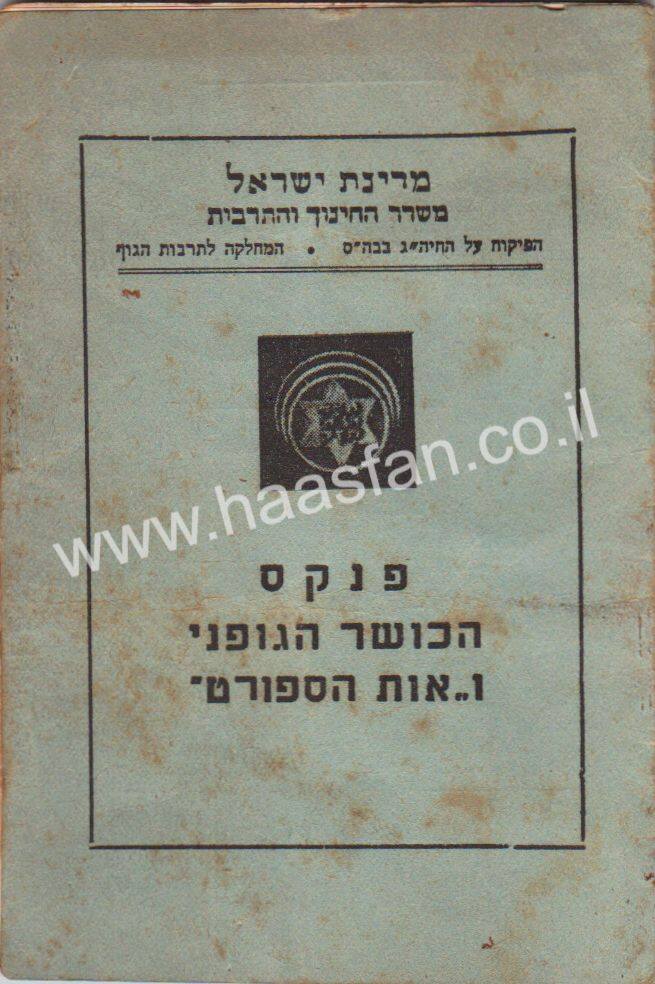 פירוט: פריט היסטורי מעניין – פנקס הכושר הגופני מס' 10947 משנות ה50 – משרד החינוך והתרבות. הייה שייך לאישה בשם רייצ'ל מילר והיה בשימוש בבתי ספר בישראל. בפנקס כתבו נתונים על התפתחות הגוף כמו משקל וגובה