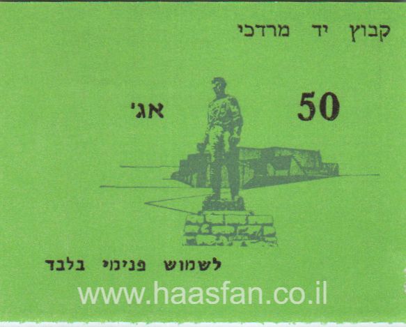 פירוט: 50 אגורות – קבוץ יד מרדכי – אמצעי תשלום / כיתוב: "לשימוש פנימי בלבד" – הקיבוץ נוסד בשנת 1943, 10 ק"מ מאשקלון