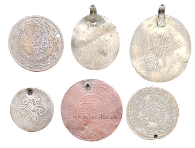 פירוט: לוט 6 מטבעות עות'מאניים, כולל מטבעות כסף – כול המטבעות עם חורים, היה מקובל להתשמש במטבעות בתור תכשיטים