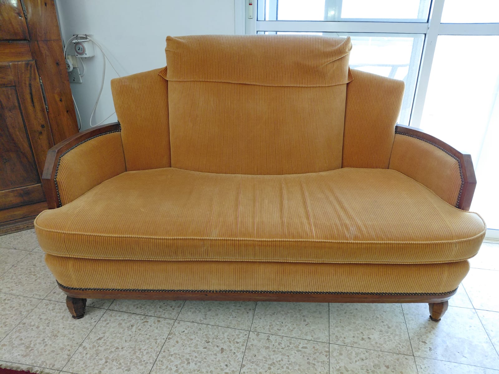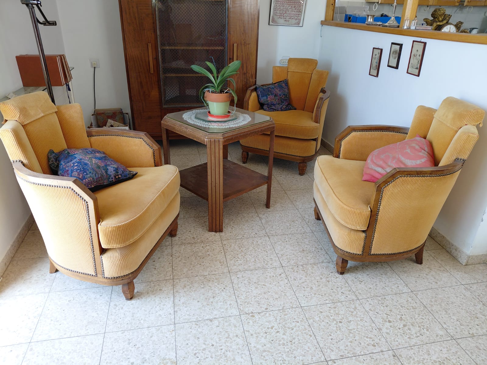 פירוט על המוצר: סט – ספה ו 3 כורסאות עץ עם ריפוד (מחודש) צהוב זהב (הספה: 160 ס"מ)